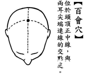 可以通过两耳角直上连线中点,来简易取此穴,但不够准确,更为准确的方法是在这个连线中点上下仔细循按,在头顶找到一个明显的凹陷。