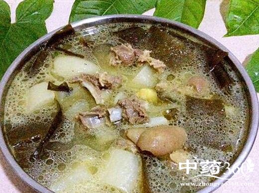 白萝卜片300克、水发海带100克;盐、味精、清汤、香菜、姜。海带和紫菜含碘丰富,白萝卜和海带一起煮汤有行气化痰消肿的功效。
