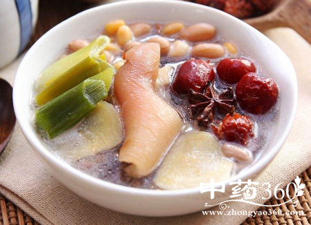 材料:猪脚,莲藕,莲子,红枣。做法:猪脚洗净砍大块,莲藕洗净切段。先把猪脚烧开水飞血水,再倒进砂锅中,加上适量的水,放进莲藕,莲子,红枣,旺火烧开,然后改小火,慢慢炖制,熬至莲藕熟软了,猪脚熟烂了即可加盐调味均匀方可食用。营养价值:莲藕能凉血,止血的作用,而且富含铁,和猪脚一起煲汤,能建脾开胃,活血养颜的功效,还能预防缺铁性贫血,老人小孩皆适宜食用。
