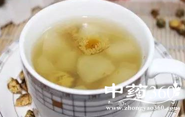 做法: 1.将雪梨洗净去皮切成大块(也可不去皮)。 2.汤锅里放水,加入雪梨。 3.放入菊花。 4.加入冰糖。 5.大火将水煮开后,加盖以小火焖煮半个小时。 6.关火,自然焖半小时,盛入器皿,即可饮用。