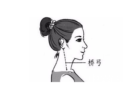 桥弓穴是指颈部翳风至缺盆的连线,此穴的部位正是人体颈动脉窦的部位。颈动脉窦是一个重要的体表-内脏反射点,起着调节血压的作用。按摩这个穴位,可使心率减慢,血管扩张,以至血压下降。另外,按摩推揉此穴还有降脂和防治咽喉、颈部、面部、头部等疾病的作用。