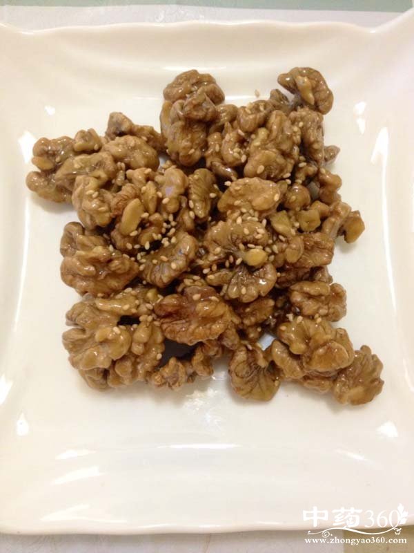 琥珀桃仁是一道汉族特色小吃,色似琥珀,香酥脆甜,甜、酥、香、脆,具有桃仁的浓郁香味,醇厚、甘爽。选用上好完整的核桃仁,水发后放入温油锅内慢慢炸熟,另起锅放入糖炒至琥珀色(请注意翻炒),投入炸好的桃仁翻匀,冷却后装盆。核桃仁含有较多的蛋白质及人体营养必需的不饱和脂肪酸,这些成分皆为大脑组织细胞代谢的重要物质,能滋养脑细胞,增强脑功能;核桃仁有防止动脉硬化,降低胆固醇的作用。