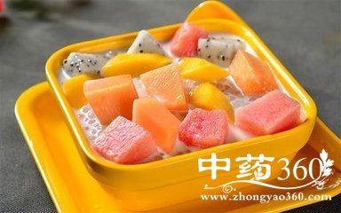 做法:西米洗净后,倒入沸水中;煮到西米半透明,把西米和热水隔开;再煮一锅沸水,将煮到半透明的西米倒入沸水中煮,直到全透明,将沸水都倒去;煮一小锅牛奶并加少许糖;将西米倒进牛奶中煮至开锅;将煮好的西米牛奶晾凉,加入水果丁,即可。