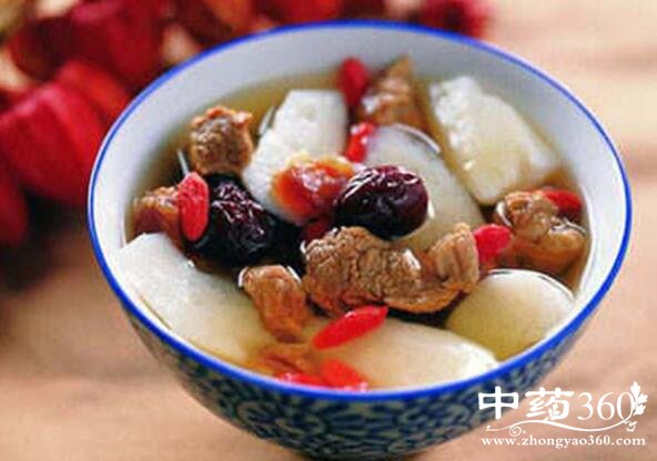 桂枣山药汤 红枣(12枚)泡软,山药(300克)去皮、切丁后,一同放入清水中烧开,煮至熟软,放入桂圆肉及砂糖调味。待桂圆肉已煮至散开,即可关火盛出食用。山药具有补脾和胃之功能;桂圆、红枣有益气血、健脾胃的作用。