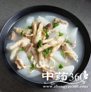 白萝卜有益胃、顺气、消食的功效。它能促进胆汁分泌,帮助消化脂肪,其中的芥子油和膳食纤维可促进胃肠蠕动,有助于体内废物的排出。因此,白萝卜跟排骨、牛肉、羊肉、猪蹄等一起煲汤,不但补气顺气,还能减轻油腻感。另外,白萝卜是人体补充钙的最佳来源之一,这种有机钙在萝卜皮中含量最多。如果不想白萝卜的辣味太重,煲汤时盖子别盖严。