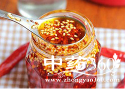 辣椒油【别名:油泼辣子】辣椒油是一种调料,其制作方法相当讲究。一般将辣椒和各种配料用油炸后制得。广受我国西南地区人们的欢迎。经常吃辣椒可能刺激胃部,甚至引起胃溃疡。但事实刚好相反。辣椒素不但不会引起胃酸分泌的增加,反而会抑制胃酸的分泌,刺激碱性黏液的分泌,有助于预防和治疗胃溃疡,而辣椒叶铁、氨基酸、粗蛋白、钙都比辣椒干含量高,尤其是铁、钙差别较大,是开发补铁、补钙保健食品的很好原料。