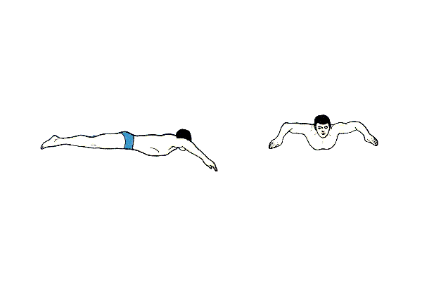1、陆上站立,体前屈,双脚分开与肩同宽,抬头,双臂前伸。两臂对称外分,稍向下划水,手掌外转,手腕微屈,这便于手掌更早对水。双臂一开始划水,头顺势抬出水。深吸气。抬头动作不要过猛,划臂动作不要超过肩线。屈肘,双手做一圆形经胸下前伸,呈预备姿势,伸手同时用口、鼻做深呼气。