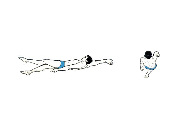 3、头在水面上学习臂部动作。蹬边滑行,屏息抬头前视。连续做几次划臂动作,意不要屈腿。