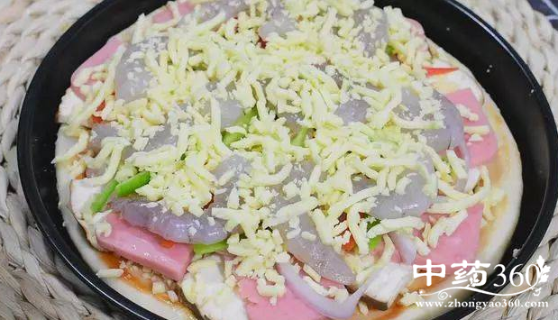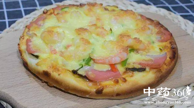 2、配料:虾仁,马苏里芝士,火腿,青椒,红椒,洋葱,杏鲍菇;