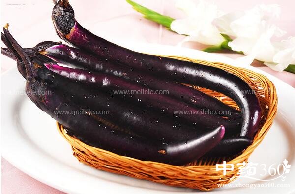茄子中维生素P的含量很高,具有增强管壁的弹性,防止血管硬化和破裂的功能。茄子纤维中含有皂草甙,经常食用可以降低胆固醇含量;茄子中的龙葵素还有抑制癌症的功效。中医理论认为,茄子性寒,有清热活血、消肿止痛的功效,可以辅助治疗内痔、痔疮出血、便血、大便干结、湿热黄疸、痛经、慢性胃炎及肾炎水肿等症。