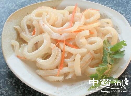 猪皮所含蛋白质的主要成分是胶原蛋白,约占85%,其次为弹性蛋白。生物研究发现:胶原蛋白质与结合水的能力有关,人体内如果缺少这种属于生物大分子胶类物质的胶原蛋白,会使体内细胞贮存水的机制发生障碍。细胞结合水量明显减少,人体就会发生“脱水”现象,轻则使皮肤干燥、脱屑,失去弹性,皱纹横生,重则影响生命。猪皮味甘、性凉、有滋阴补虚,清热利咽的功使。现代,科学家们发现,经常食用猪皮或猪蹄有延缓衰老和抗癌的作用。因为猪皮中含有大量的胶原蛋白,能减慢机体细胞老化。尤其对阴虚内热,出现咽喉疼痛、低热等症的患者食用更佳。