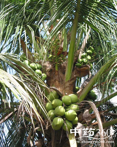 椰子性味甘、平,入胃、脾、大肠经;果肉具有补虚强壮,益气祛风,消疳杀虫的功效,久食能令人面部润泽,益人气力及耐受饥饿,治小儿涤虫、姜片虫病;椰水具有滋补、清暑解渴的功效,主治暑热类渴,津液不足之口渴;椰子壳油治癣,疗杨梅疮。