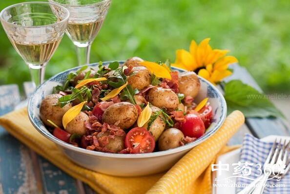 2、土豆煮熟,去皮,压成泥,与其余材料、沙拉酱拌匀,装入番茄碗中即可。