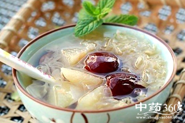食疗方法:冰糖雪梨水,把雪梨去皮后切成小块,放入锅中,加入适量的水与些许冰糖一起熬煮,熬煮二十分钟左右即可食用。