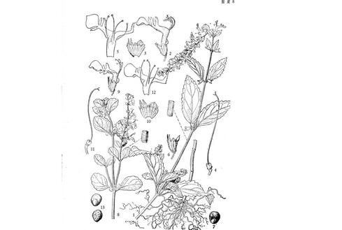 【原形态】安龙香科科,多年生草本。茎直立或上升,多分枝,细弱弯曲,长60-70cm,被小钩毛。叶柄长3-9mm,被糙伏毛或小钩毛;叶片小,卵圆形或倒圆形,长1.2-3.8cm,宽0.8-2.2cm,上面被贴生的糙伏毛,下面被糙硬毛,先端圆形或钝,基部楔形下延,边缘具波状圆齿或圆齿,侧脉2-3对,与中肋在上面凹陷,下面凸起。穗状花序于分枝上部顶生,由偏于一边、极松散的具2花的轮梓花序所组成;苞片椭圆形至近圆形,长1.5-5mm,宽1.2-3.8mm,具短柄,全级,具缘毛;花梗细,长约2mm,被糙伏毛或小钩毛;花萼钟形,长约5mm,宽约3.5mm,外面在下部沿脉上被疏柔毛,余部有淡黄色腺点,内面在喉部有一环睫毛;花冠白色或淡紫色,外面有白色泡状毛,内面有喉部下方有泡状毛,冠筒长约6mm,唇片长达1cm,与花冠筒成直角伸出,中裂片倒卵状近圆表,宽约3.8mm,侧裂片前对短,长0.7mm,后对较长,长约1mm,常2-3枚发育,黄棕色,具网状纹。花期10月。