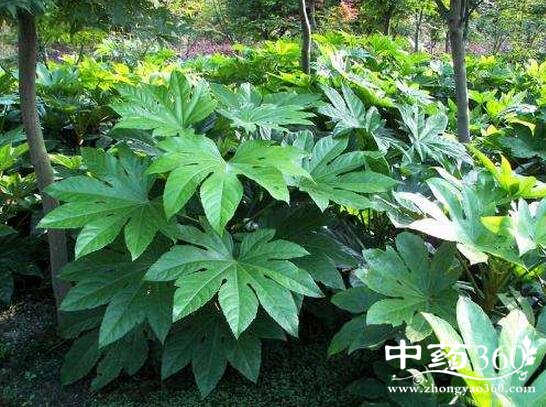 【原形态】常绿灌木或小乔木,高可达5m。茎光滑无刺。叶柄长10-30cm;叶片大,革质,近圆形,直径12-30cm,掌状7-9深裂,裂片长椭圆状卵形,先端短渐尖,基部心形,边缘有疏离粗锯齿,上表面暗亮绿以,下面色较浅,有粒状突起,边缘有时呈金黄色;侧脉搏在两面隆起,网脉在下面稍显着。圆锥花序顶生,长20-40cm;伞形花序直径3-5cm,花序轴被褐色绒毛;花萼近全缘,无毛;花瓣5,卵状三角形,长2.5-3mm,黄白色,无毛;雄蕊5,花丝与花瓣等长;子房下位,5室,每室有1胚球;花柱5,分离;花盘凸起半圆形。果产近球形,直径5mm,熟时黑色。花期10-11月,果熟期翌年4月。