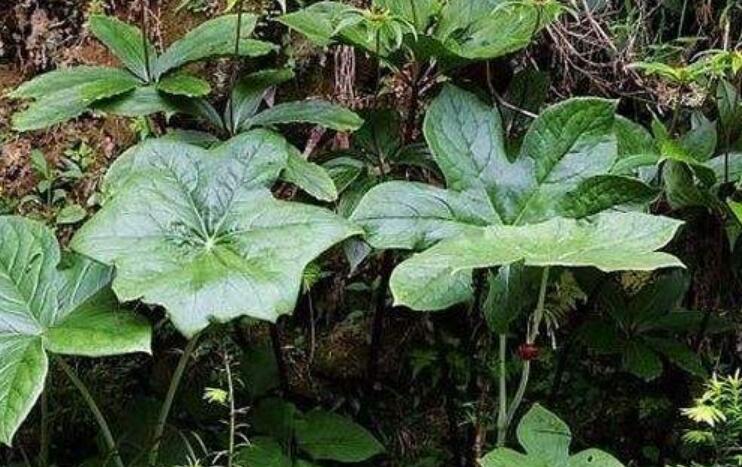 【植物形态】多年生草本,植株高40-150厘米。根状茎粗状,横生,多须根;茎直立,不分枝,无毛,淡绿色。茎生叶2枚,薄纸质,互生,盾状,近圆形,直径达30厘米,4-9掌状浅裂,裂片阔三角形,卵形或卵状长圆形,长2.5-4厘米,基部宽5-7厘米,先端锐尖,不分裂,上面无毛,背面被柔毛,叶脉明显隆起,边缘具细齿;下部叶的柄长12-25厘米,上部叶柄长1-3厘米。花梗纤细、下弯、被柔毛;花深红色,5-8朵簇生于离叶基部不远处,下垂;萼片6,长圆状椭圆形,长0.6-1.8厘米,宽6-8毫米,先端急尖,外面被短柔毛,内面无毛;花瓣6,勺状倒卵形,长约2.5厘米,宽约8毫米,无毛;雄蕊6,长约1.8厘米,花丝短于花药,药隔先端急尖,无毛;子房椭圆形,无毛,花柱短,柱头盾状。浆果椭圆形,长约4厘米,直径约3.5厘米。种子多数。花期3-6月,果期5-9月。为多年生草本植物,地下有横走根茎,根茎粗壮,连续留有老茎枯死后的残痕。茎单一直立,株高30-60厘米,茎顶部具1-2叶。叶盾形,展开呈圆形,直径10-30厘米,四周4-9浅裂,边缘具细齿。花数朵着生于叶柄顶端,花下垂,花瓣6枚,倒卵形,长2-2.5厘米,深红色。上位子房,结椭圆形浆果。