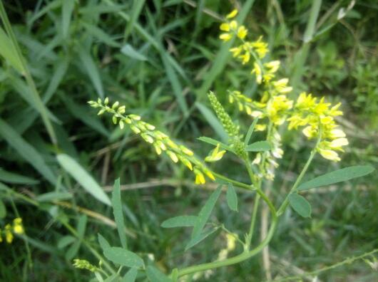 【原形态】草木犀(《释草小记》)二年生或一年生草本,高60~120厘米。茎直立,多分枝。3出羽状复叶,互生;小叶椭圆形或倒披针形,长10~15毫米,宽约5毫米,基部楔形,先端钝,边缘自基部以上有疏齿;总叶轴长1~2厘米;托叶线形,长约5毫米。总状花序腋生或顶生,长而纤细,具多数花;花小,长3~4毫米,具苞片与短梗:萼钟状,5裂;花冠蝶形,黄色,旗瓣长椭圆形,长于翼瓣,翼瓣钝形;雄蕊10,9枚联合;雕蕊1。荚果倒卵形,下垂,具网纹,无毛。种子单一。花期5~7月。果期8~9月。