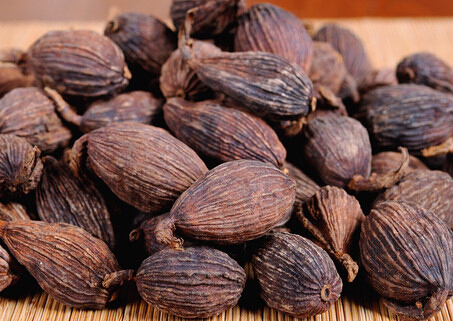 草果为姜科植物草果的成熟果实。草果多年生草本,生于沟边林下,分布于广西和云南南部地区,果实成熟呈红褐色时采收,晒干或烘干,或用沸水烫2至3分钟后,再晒干或烘干。草果最早史载于明代,我国云南是草果的主产地,至今已有200多年的历史。草果是药食两用中药材大宗品种之一,食用量大于药用量。