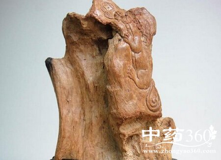 本品呈不规则块、片状或盔帽状,有的为不碎块。表面凹凸不平,有刀痕,偶有孔洞,可见黑褐色树脂与黄白色木部相间的班纹。孔洞及凹窝表面多呈朽木状。质较坚实,断面枣状。气芳香,味苦。
