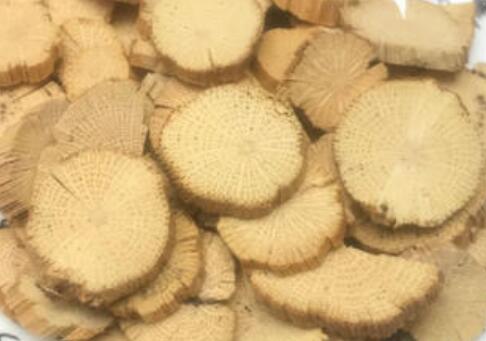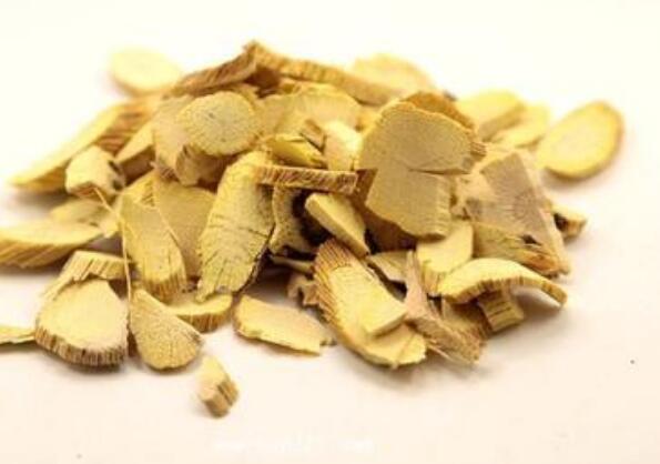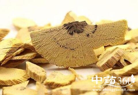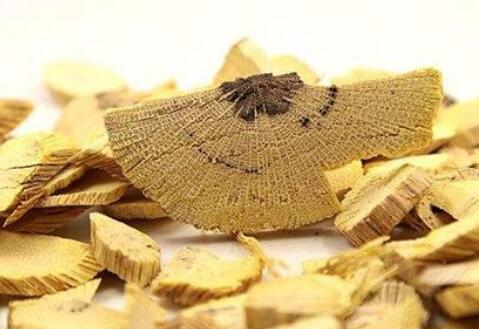 药材性状】长圆形,略扭曲,长50~100厘米,直径2~3.5厘米。表面黄棕色或黄褐色,有纵向凹沟及棱线;节处多膨大,有叶痕及侧枝痕。残存皮部易撕裂。质坚硬,不易折断。切片厚0.2~0.4厘米,边缘不整齐,残存皮部黄棕色,木部浅黄棕色或浅黄色,有黄白色放射状纹理及裂隙,其间布满导管孔,髓部较小,类白色或黄棕色,偶有空腔。无臭,味淡。