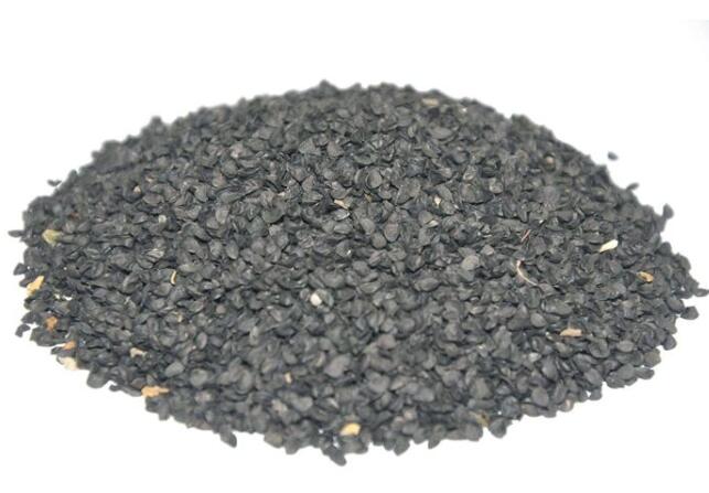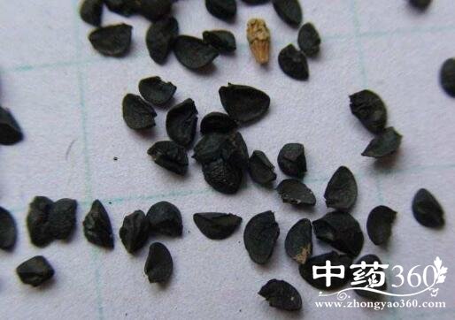 【药材性状】种子三角状扁卵形,一面微凹,另面隆起,有棱线1~2条,长3~4毫米,宽2~3毫米。表面黑色,多光滑或偶有疏皱纹,凹面平滑。基部有两个突起,较短的突起先端灰棕色或灰白色,为种脐,较长的突起先端为珠孔。纵切面可见种皮菲薄,胚乳灰白色,胚白色,弯曲,子叶1枚。体轻,质坚硬。气特异,嚼之有葱味。以粒饱满、色黑、无杂质者为佳。