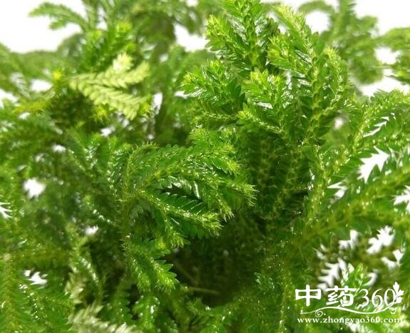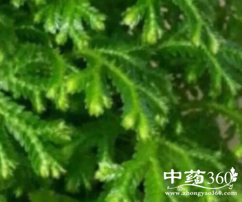 【药材性状】多卷缩,长20~50厘米。茎纤细,直径约1毫米,有纵棱,淡黄色或黄绿色,节上常具细长的不定根。小枝互生,其上再作羽状或叉状分枝。主茎上的叶疏生,斜椭圆形,全缘;分枝上的叶密生,二形,背、腹各2列,全缘,中叶小,长卵形,侧叶作羽状排列,卵状椭圆形,黄绿色。有时可见孢子囊穗生于枝端。质较柔软。气微,味淡。