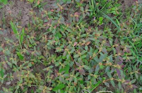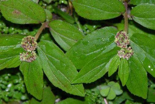 【原形态】飞扬草 一年生草本。被硬毛,含白色乳汁。茎通常自基部分枝;枝常淡红色或淡紫色;匍匐状或扩展,长15-40cm。叶对生;托叶小,线形;叶片披针状长圆形至卵形或卵状披针形,长1-4cm,宽0.5-1.3cm,先端急尖而钝,基部圆而偏斜,边缘有细锯齿,稀全缘,中央常有1紫色斑,两面被短柔毛,下面沿脉的毛较密。杯状花序多数密集成腋生头状花序;花单性;总苞宽钟状,外面密被短柔毛,顶端4裂;腺体4,漏斗状,有短柄及花瓣状附属物;雄花具雄蕊1;雌花子房3室,花柱3。蒴果卵状三棱形,被短柔毛;种子卵状四棱形。花期全年。
