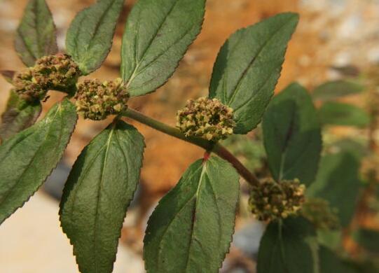 本品长15-50cm,地上部分被粗毛。根细长而弯曲,表面上黄色。老茎近圆柱形,嫩茎稍扁或具棱,直径1-3mm;表面土黄色至浅棕红色或褐色;质脆,易折断,断面中空。叶对生,皱缩,展平后呈椭圆状卵形至近棱形,或破碎不完整;完整叶长1-4cm,宽0.7-1.6cm,灰绿色至褐绿色,先端急尖,基部偏斜,边缘有细锯齿,有3条较明显的叶脉。杯状聚伞花序密集呈头状,腋生。蒴果卵状三棱形。无臭,味淡微涩。以茎粗壮,叶多、色绿者为佳。