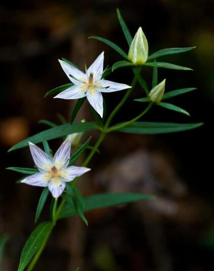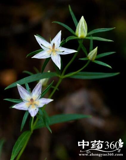 【植物形态】一年生草本,高15~30厘米。根通常黄色,粗壮,叶苦。茎直立,四棱形,沿棱具窄翅,有时具微点状突起,通常多分枝。叶对生,线状披针形或线形,长1.5~4厘米,宽2~6厘米,先端长渐尖,全缘,基部渐狭,无毛。花梗直立,长10~25毫米,花5基数,萼片长10~15毫米,先端锐尖或渐尖,花冠淡蓝紫色,管部长1~1.5毫米,裂片窄卵形,先端渐尖,基部具2囊状淡黄色腺窝,其边缘具白色流苏状长毛,花药狭椭圆形,长2.5~3毫米。蒴果狭卵形或长圆形。种子多数,卵圆形。花果期9~10月。