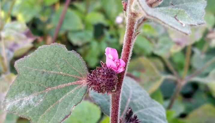 直立亚灌木状草本,高达1m。小枝被星状绒毛。叶互生;叶柄长1-4cm,被灰白色星状毛;托叶线形,长约2mm,早落;茎下部的叶近圆形,长4-5cm,宽5-6cm,先端浅3裂,基部圆形或近心形,边缘具锯齿;中部的叶卵形,长5-7cm,宽3-6.5cm;上部的叶长圆形至披针形,长4-7cm,宽1.5-3cm;叶上面被柔毛,下面被灰白色星状绒毛。花腋生,单生或稍丛生,淡红色,直径约15mm;花梗长约3mm,被绵毛;小苞片5,长约6mm,基部合生;花萼杯状,裂片5,较小苞片略短,两者均被星状柔毛;花瓣5,倒卵形,长约15mm,外面被星状柔毛;雄蕊柱长约15mm,无毛;花柱枝10,微被长硬毛。果扁球形,直径约1cm,分果爿被星状短柔毛和锚状刺。花期7-10月。