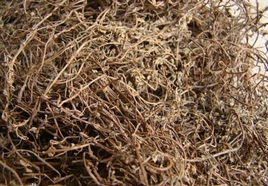 全草缠绕成团状,灰绿色或灰褐色。主根一条,粗0.2~0.4cm,须根纤细,淡灰棕色。茎纤细,略带方形或扁圆柱形,粗约0.1cm,有分枝,秃净无毛,质脆易折断,中央有白色髓部。叶对生,无柄,极皱缩,易破碎脱落,展平后叶片呈线形至线披针形,长1~3.5cm,宽0.1~0.2cm,有托叶长0.1~0.2cm。蒴果1个或2个生于叶腋,扁球形呈石榴状,灰绿色或灰褐色,柄长0.2~0.3cm,气微,味淡。