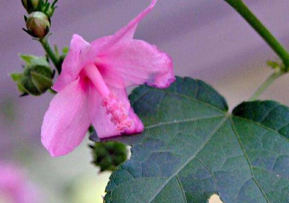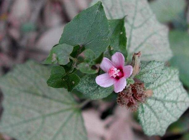 【原形态】梵天花 小灌木,高约80cm。枝平铺,小枝被星状绒毛。叶互生;叶柄长4-15mm,被绒毛;托叶钻形,长约1.5mm,早落;下部的叶轮廓为掌状3-5深裂,裂口深达中部以下,圆形而狭,长1.5-6cm,宽1-4cm,裂片菱形或倒卵形,呈葫芦状,先端钝,基部圆形至近心形,具锯齿,两面均被星状短硬毛,上部的叶通常3深裂。花单生或近簇生,花梗长2-3mm;小苞片长约7mm,基部合生,疏被星状毛;萼较短于小苞片或近等长,卵形,尖头,被星状毛;花冠淡红色,花瓣长10-15mm;雄蕊柱无毛,与花瓣等长。果球形,直径约6mm,具刺和长硬毛,刺端有倒钩。种子平滑无毛。花期6-9月。