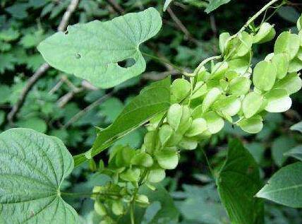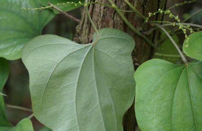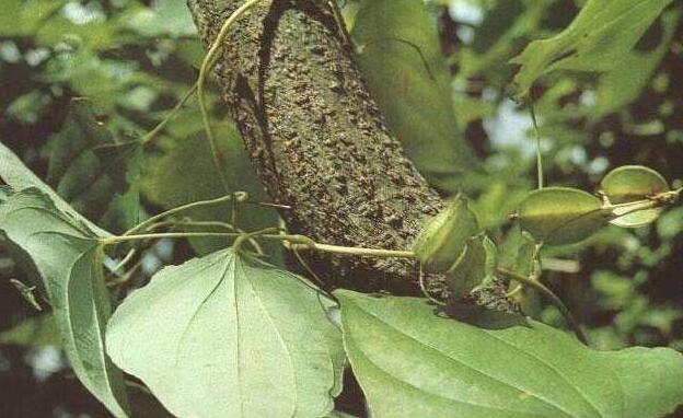 【植物形态】多年生缠绕草质藤本。根状茎横走,粗厚,多细长须根。茎纤细,左旋。单叶互生,纸质,叶片三角状心形或卵状披针形,顶端渐尖,边缘波状,叶干后近黑色,下面灰白色。花黄绿色,单性,雌雄异株,雄花为腋生向上的穗状花序,花单生或2~3朵簇生,花被6裂,雄蕊3,退化雄蕊3,互生,雌花为下垂的穗状花序,花单生,花被6,柱头3裂。蒴果近圆形,微被白粉,有3翅,成熟后向上反转。花期5~8月,果期6~10月。