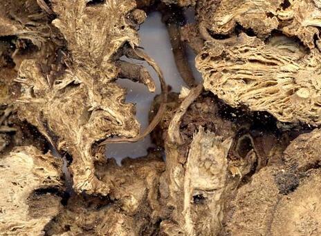 藁本:根茎呈不规则结节状圆柱形,稍扭曲,有分枝,长3—10cm,直径1—2cm。表面棕褐色或暗棕色,粗糙,有纵皱纹,上侧残留数个凹陷的圆形茎基,下侧有多数点状突起的根痕及残根。体轻,质较硬,易折断,断面黄色或黄白色,纤维状。气浓香,味辛、苦、微麻。