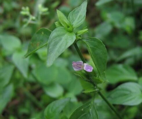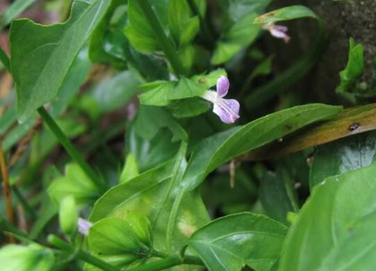 狗肝菜 一年或二年生草本,同30-80cm。直立或近基部外似,节常膨大呈膝状,被疏毛。叶对生;柄长5-25cm;叶片纸质;卵状椭圆形,长2.5-6cm,宽1.5-3.5cm,先端短渐尖,基部阔楔形或稍下延。花序腋生或顶生,聚伞式,多个簇生,稀单生;总苞片阔倒卵形或近圆形,稀披针形,大小不等,长6-10mm,具脉纹,被柔毛;小苞片线状披针形,长约4mm;花萼5裂,钻形,长约4mm;花冠淡紫红色,长约10mm,被柔毛,二唇形,上唇阔卵状,近圆形,全缘,有紫红色斑红色,长约10mm,被柔毛,二唇形,上唇阔卵状,近圆形,全缘,有紫红色斑点,下唇长圆形,3浅裂;雄蕊2,着生于花冠喉部,花药2室,2药室一上一下,花丝被柔毛;子房2室。蒴 果长约6mm,被柔毛。种子坚硬,扁圆,褐色。花期10-11月,果期翌年2-3月。