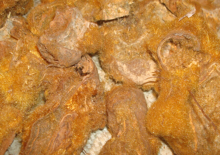 取净砂子置锅内,用武火炒热,加入净狗脊片,拌炒至鼓起,绒毛呈焦褐色,取出,筛去砂子,放凉,除去残存绒毛。