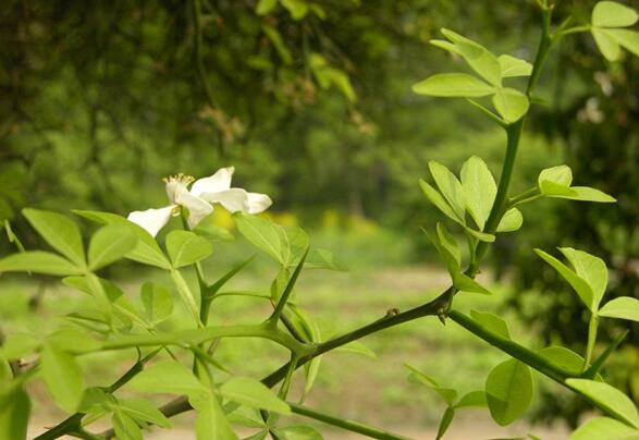 【原形态】枸橘 落叶灌木或小乔木。茎无毛;分枝多,小枝呈扁压状。茎枝具腋生粗大的棘刺,长1-5cm,刺基部扁平。叶互生,三出复叶;叶柄长1-3cm,宽2-5mm;顶生小叶倒卵形或椭圆形,长1.5-6cm,宽0.7-3cm,先端微凹或圆,基部楔形,边缘有不明显小锯齿;侧生小叶较小,椭圆状卵形,基部稍偏斜,幼嫩时在主脉上有短柔毛,具半透明油腺点。花白色,具短柄,单生或成对生于二年生枝条叶腋,常先叶开放,有香气;萼片5,卵状三角形,长5-6mm;花瓣5,倒卵状匙形,长1.5-3cm,宽0.5-1.5cm;雄蕊8-20或更多,长短不等;雌蕊1,子房近球形,密被短柔毛,6-8室,每室具数枚胚珠,花柱粗短,柱头头状。柑果球形,直径2-5cm,熟时橙黄色,密被短柔毛,具很多油腺,芳香,柄粗短,宿存于枝上。种子多数。花期4-5月,果期7-10月。