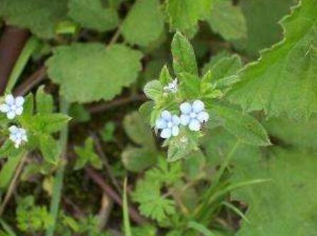 【原形态】一年生草本,高15-30cm。茎基部通常多分枝,细弱,平卧或上部斜升,被向上贴伏的糙伏毛。叶互生;下部叶有柄,上部叶渐小,无柄;叶片椭圆形或狭椭圆形,长1-2.5cm,宽5-15mm,先端钝,具小凸尖,基部宽楔形,两面均被向上贴伏的糙伏毛或短硬毛。花序柔弱,细长;花小,单生于叶腋或近于腋生;苞片椭圆形或狭卵形;被伏毛或硬毛;花梗果期不增长;花萼5深裂,裂片披针形或卵状披针形,果期增大,外面密生向上的伏毛;花冠蓝色或淡蓝色,稀白色,长1.5-3mm,先端裂片圆形,喉部有5枚梯形附属物;雄蕊5,内藏子房4裂,花柱短,柱头头状。小坚果4,肾形,长1-1.5mm,表面密生小疣状突起。腹面呈纵椭圆形的环状凹陷。花期4-6月,果期6-10月。