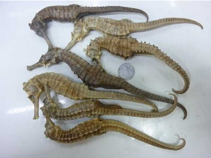 《百草镜》:海龙乃海马中绝大者,长四、五寸至尺许不等,皆长身,而尾直不作圈,入药功力尤倍,虽同一类,形状微有不同。此物广州、南海亦有之、体方,周身如玉色,起竹节纹,光莹耀目,诚佳品也。