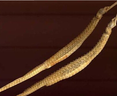 《纲目拾遗》:《赤嵌集》,海龙,产澎湖澳,冬日双跃海滩,渔人获之,号为珍物,首尾似龙,无牙、爪,大者尺余,入药。《译史》,此物有雌雄,雌者黄,雄者青。