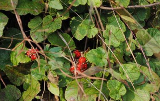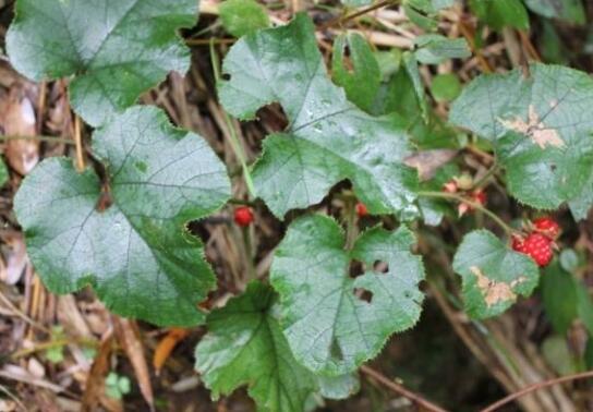 【原形态】寒莓 蔓性常绿小灌木。茎常伏地生根,长出新株,密生褐色或灰白色柔毛,无刺或有少数刺;葡匐枝长达2m。单叶;叶柄长3-9cm;托叶条裂;叶片近圆形,直径5-11cm,先端急尖或圆钝,基部心形,边缘常5浅裂,上面近无毛,下面和叶柄有绒毛,沿叶脉较密。总状花序短,腋生,有花4-10朵,密集;总花梗和花梗密生灰白色短绒毛和散生的刺刚毛;花白色,直径约1cm;萼裂片披针形,外面淡黄色长毛。聚合果近球形,直径6-10mm,紫黑色。花期7-8月,果期9-10月。
