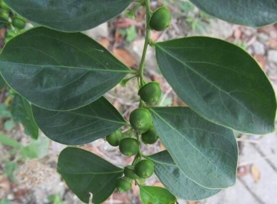 【原形态】 直立灌木,高2—3米。树皮灰棕色,枝圆柱状,多叉状弯曲,表面有白色细小皮孔。单叶互生;有短柄;卵形或卵状披针形,长3—5厘米,宽1.5—2.5厘米,先端钝形或短尖,基部楔形,全缘,叶脉细小,下面隆起,叶革质,上面暗绿色,下面灰绿色,干后变黑色。花极小,2—4朵腋生,单性,同株;无花瓣和花盘;雄花花萼呈陀螺形或半圆形,截头状,边缘甚厚,有时分裂;雄蕊3,花丝合生成一柱;退化子房缺;雌花花萼稍大,基部呈陀螺形,上部扩张,结果时扩大成盘状或杯状;退化雄蕊缺;子房球形,花柱3枚,2裂。核果球形,径约6毫米,位于宿存萼上。花期4—9月。