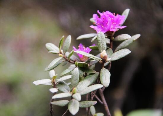【原形态】常绿小灌木,高1-1.5cm。茎直立,分枝密,枝条纤细,灰棕色,幼枝密被鳞片,老枝纵棱明显,茎黑褐色,芽鳞早落。叶柄短,有鳞片;叶近革质,集生于小枝顶端,狭长圆状披针形,长5-12cm,宽2-4mm,两端钝或圆,边缘微反卷,两面密生银白色鳞片。花常单一或成双着生于小枝顶端,芳香;花萼小,外被鳞片;花冠蓝紫色,5裂,裂片卵圆形;雄蕊10,伸出花冠筒外,花丝基部有柔毛;子房1,卵圆形,密生鳞片,花柱紫色,短于雄蕊,柱头头状。蒴果卵形,长2mm,有鳞片和宿存的花柱。