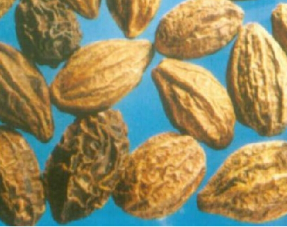 外观呈长圆形或卵圆形,长约2~4厘米,直径2~2.5厘米,质地粗糙坚硬,表面有5~6条纵棱线及不规则皱纹,基部有圆形果柄痕;表面为黄棕色或暗棕色,果肉呈黄棕色或黄褐色;种子呈狭长纺锤形,种皮黄棕色,子叶两枚,相互重叠卷旋;嗅之无臭,口尝味先酸涩,后回微甜。