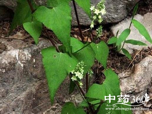 【植物形态】多年生蔓性草本。根状茎膨大成块状,木质。茎细长,中空,绿紫色,先端分枝。托叶鞘膜质,褐色,近乎透明。叶互生;叶柄长0.5—5厘米,上面具沟,下面具粘质乳头状突起或具微小纤毛;叶片长圆状椭圆形,长6—11厘米,宽3—6厘米,圆锥花序顶生或腋生;花具明显小梗;花被白色或淡紫色,5裂,外侧裂片中脉具翅;雄蕊8;子房三棱状,柱头3,盾状。小坚果三棱形,黑紫色,为扩大的膜质翅的花被所包。花期夏季。