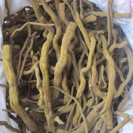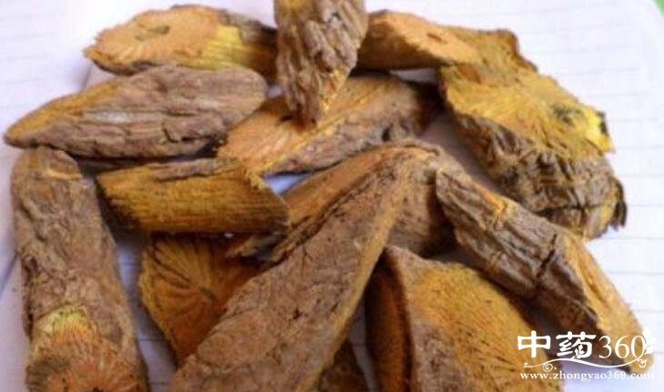 ①干燥根呈圆柱形,弯曲扭转,长15~75厘米,粗0.5~2厘米。外表土棕色,去栓皮后呈棕黄色,皮孔不明显;皮部易剥落。横切面木栓层极薄,暗棕色;韧皮部发达;木质部放射状排列,多空隙,坚硬,韧皮部与木质部均鲜黄色。味极苦,能使唾液成黄色。