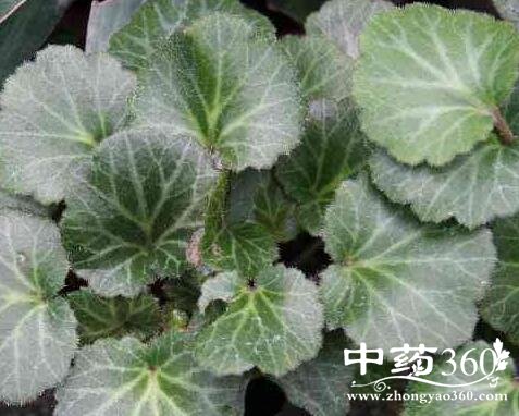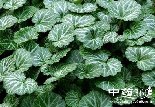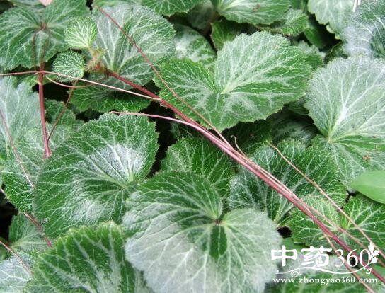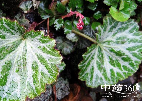 【植物形态】多年生常绿草本。高14~45厘米,有细长的匍匐茎,带红紫色。叶通常数枚基生,肉质,密生长柔毛,叶柄很长;叶片广卵形呈肾形,基部心形或截形,边缘有不规则钝锯齿,两面有长伏毛,上面有白色斑纹,下面紫红色或有斑点。圆锥花序稀疏,花梗有短腺毛;花两侧对称;萼片5,不等大,卵形;花瓣5,白色,下面2瓣大于其他3瓣,披针形,上面3小花瓣卵形,都有红色斑点;雄蕊10;心皮2,合生。蒴果卵圆形。花期6~7月,果期10~11月。