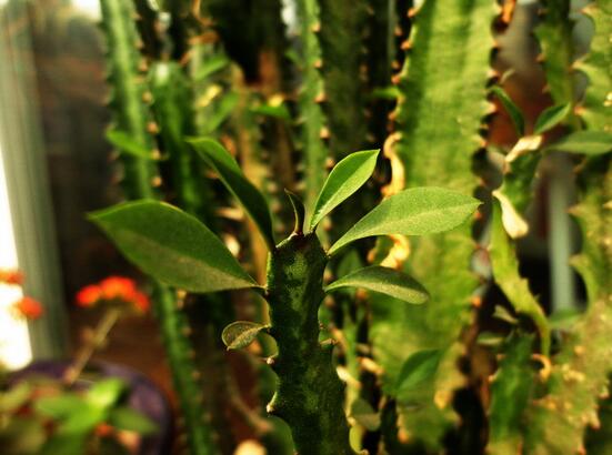 在广东有人把火殃勒叫做霸王鞭,它的花比较小,很不显眼,但它挺拔的肉质茎和顶部浓密的像皮革一样的大叶子,四季常青,有点当年霸王所用钢鞭那种刚劲有力的威武劲头。因而旧时的花店都习惯在入口处各摆一盆霸王鞭,很多家庭也喜爱,它犹如两个手持钢鞭的守门卫士,具有辟邪的意思。