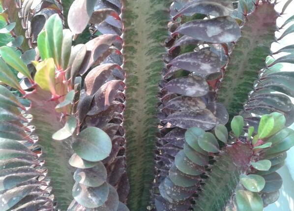 火殃勒,大戟科肉质灌木状小乔木。乳汁丰富,茎常三棱状,偶有四棱状并存,边缘具明显的三角状齿,叶常生于幼枝顶部,倒卵形或倒卵状长圆形,花序单生于叶腋,总苞宽钟状,雄花多数,雌花一枚,花柄常伸出总苞之外,花柱3,分离,柱头2浅裂,蒴果三棱状扁球形,成熟后三裂。全年开花结果。原产印度,我国各地作观赏栽培。全株入药,具散瘀消炎、清热解毒之效。
